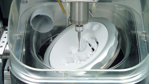 A digital design file of the restoration or abutment is sent to the mill, and then milled from a solid block of zirconia,